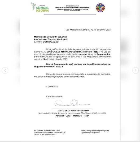 Para agravar ainda mais a situação com o início dos shows de São João no município nesta sexta-feira (23), os guardas foram intimados pelo secretário de segurança, Carlos Oliveira, a trabalharem das 17h às 06h sem serem renumerados e desrespeitando a lei municipal que garante a categoria a escala de 24 horas de serviço por 96 horas de descanso, e foram avisados que caso não cumpram essa determinação estão sujeitos a punição na corregedoria.