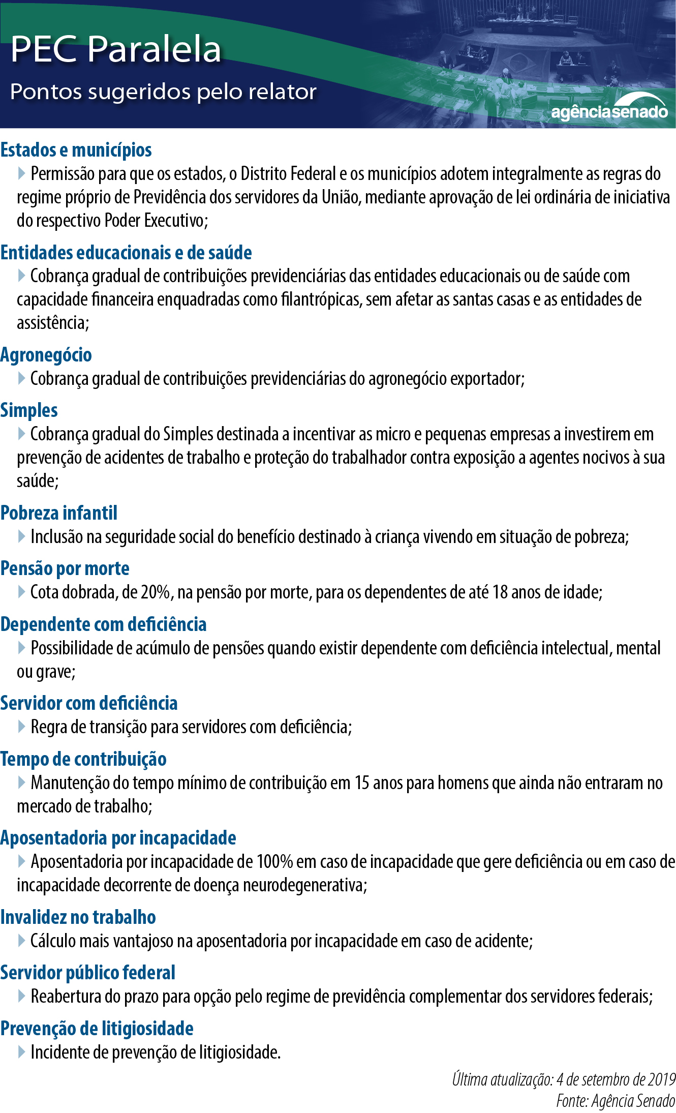 Tasso acrescentou outros pontos à PEC paralela – proposta que vai reunir pontos que ficaram de fora na proposta de reforma da Previdência (PEC 6/2019) – como a previsão de benefício destinado à criança vivendo em situação de pobreza. A PEC paralela vai contemplar também a inclusão de estados e municípios nas novas regras para aposentadoria.
