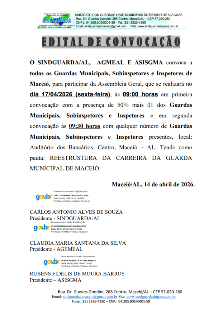 O SINDGUARDA/AL, AGMEAL e ASISGMA convocam todos os guardas municipais, subinspetores e inspetores de Maceió para participarem da Assembleia Geral, que se realizará no dia 17/04/2026 (sexta-feira), às 9h, em primeira convocação, com a presença de 50% mais 1 dos guardas municipais, subinspetores e inspetores, e, em segunda convocação, às 9h30, com qualquer número de guardas municipais, subinspetores e inspetores presentes, no Auditório dos Bancários, localizado no Centro de Maceió – AL. A assembleia terá como pauta: reestruturação da carreira da Guarda Municipal de Maceió.