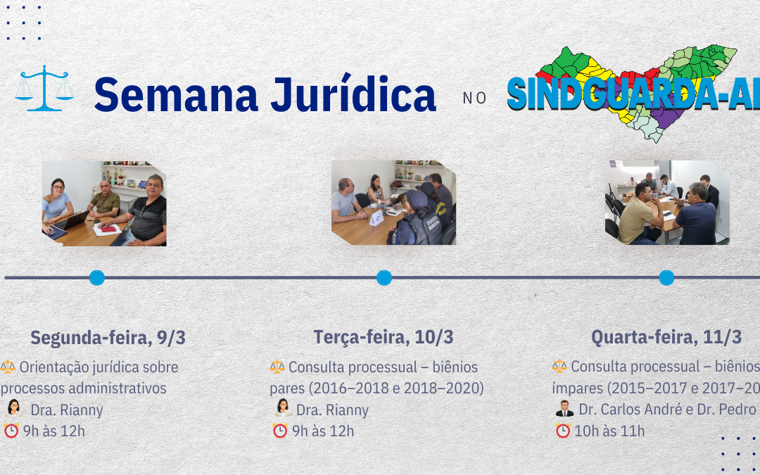 O Sindguarda-AL realizará, de segunda a quarta-feira, uma Semana Jurídica com mutirão de atendimento especializado voltado aos guardas municipais de Maceió. Durante três dias, a sede do sindicato receberá advogados para orientar a categoria sobre diferentes demandas jurídicas relacionadas à carreira.
