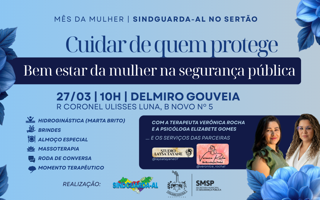 Dando continuidade às atividades em alusão ao Mês da Mulher, o Sindicato dos Guardas Civis Municipais de Alagoas (Sindguarda-AL) realizará, no próximo dia 27 de março (sexta-feira), o evento “Cuidar de quem protege: Bem-estar da mulher na segurança pública”, voltado às guardas municipais femininas da região do Sertão.